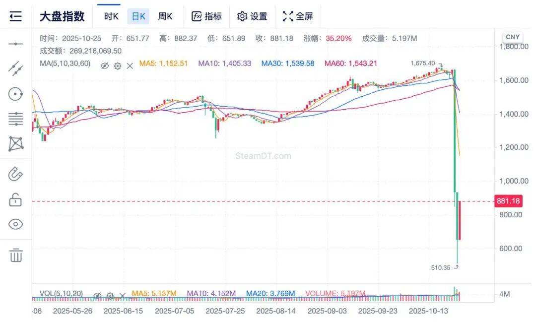 根据饰品市场指数监测网站steamdt,两天内,大盘从1663点暴跌至652点,跌幅超过60%。在10月25日,市场略有回升,目前维持在881点,也是腰斩的跌幅。而热门饰品“蝴蝶刀”两天内价格从20719元跌至5280元,跌幅接近75%。