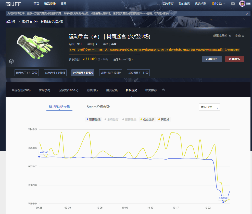 南都N视频记者在网易BUFF等第三方交易网看到,CS游戏道具在网站上显示的价格在23日直线下跌,甚至出现腰斩的情况。