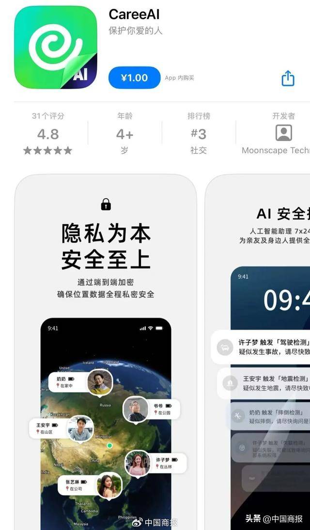 在开发“死了么”App之前,这个团队还在苹果应用商店上架过另外一款叫CareeAI的App,主打7×24小时在线的专属家庭安全助理,说明该团队对安全监测领域有持续的关注和探索。