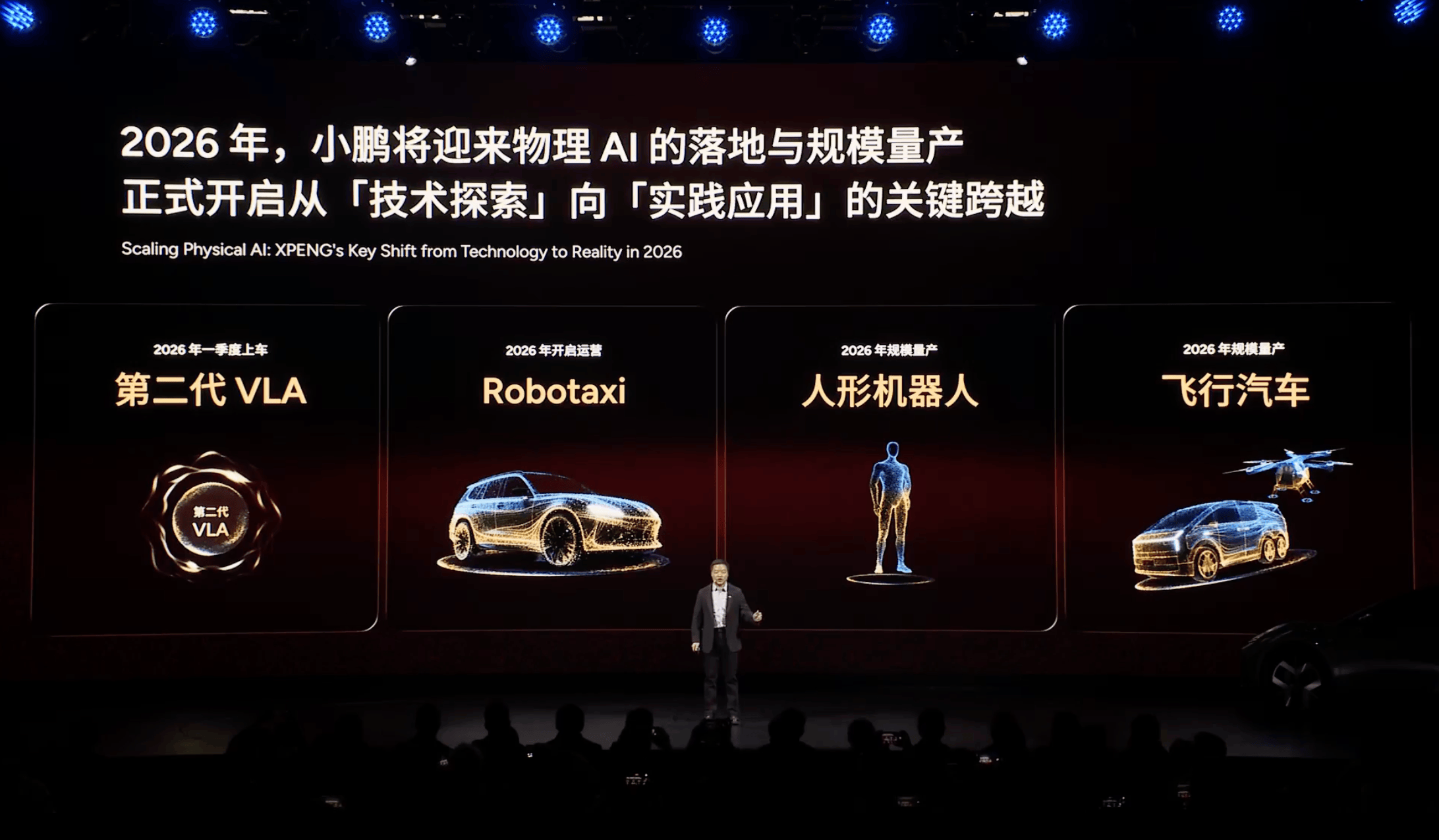 2026 年第一季度第二代 VLA 上车;2026 年开启运营 Robotaxi;2026 年规模量产人形机器人;2026 年规模量产飞行汽车。