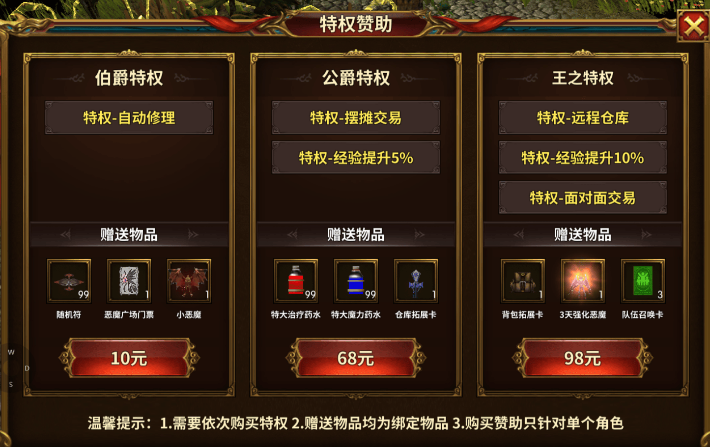 唯一的永久特权分为三个档位,10元的伯爵特权、68元的公爵特权与98元的王之特权,且这些特权仅为便捷性提升,并非战力碾压的关键。公爵特权解锁的0手续费摆摊交易权,与王之特权开启的面对面交易权,更多是为玩家的交易行为提供便利,而非制造付费玩家与免费玩家的鸿沟。这种轻量化的付费设计,让玩家无需背负沉重的氪金压力,无论是零氪的休闲玩家,还是愿意小额付费提升体验的玩家,都能在游戏中找到属于自己的节奏。