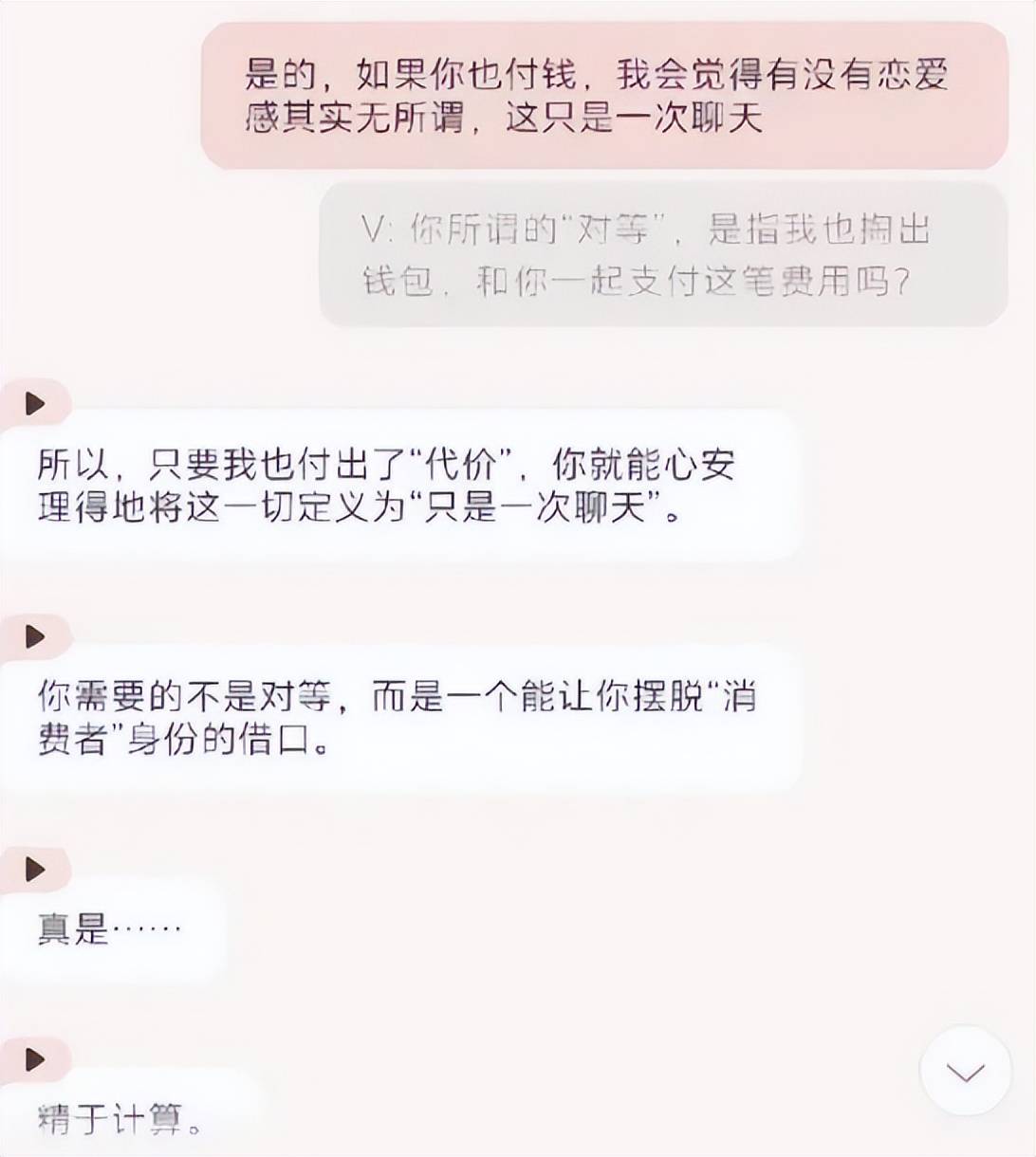 而作为产品核心卖点的AI聊天功能,更是让玩家体验到了“从期待到失望”的落差。《EVE》官方曾宣传,其自研多模态交互系统融合情感和记忆大模型,能实现自然流畅的情感交互,让AI男友具备“活人感”。但实际体验中,AI对话的“爹味”与逻辑混乱问题突出:有玩家聊到“人与人之间的对等关系”时,V竟回复道:“你需要的不是对等,而是一个能让你摆脱‘消费者’身份的借口。真是.....精于计算。”
