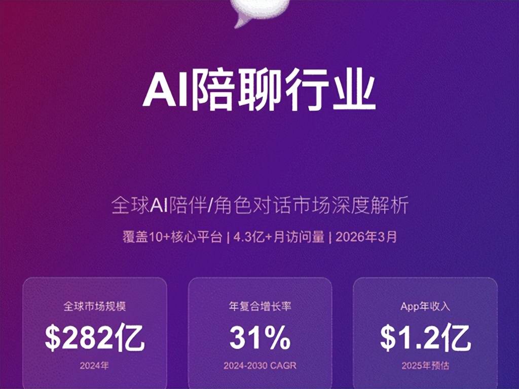 3 月,根据解数咨询与 D17 联合发布《全球 AI 陪伴 / 角色对话市场深度解析》报告,全球 AI 陪聊行业2024 年全球市场规模已达 282 亿美元,2024-2030 年年复合增长率预计达 31%,2026 年 2 月核心平台月度总访问量突破 4.3 亿次,AI 陪聊正从单一聊天工具向情感伴侣、功能服务综合体升级,同时监管趋严、赛道分化也成为行业发展的核心关键词。