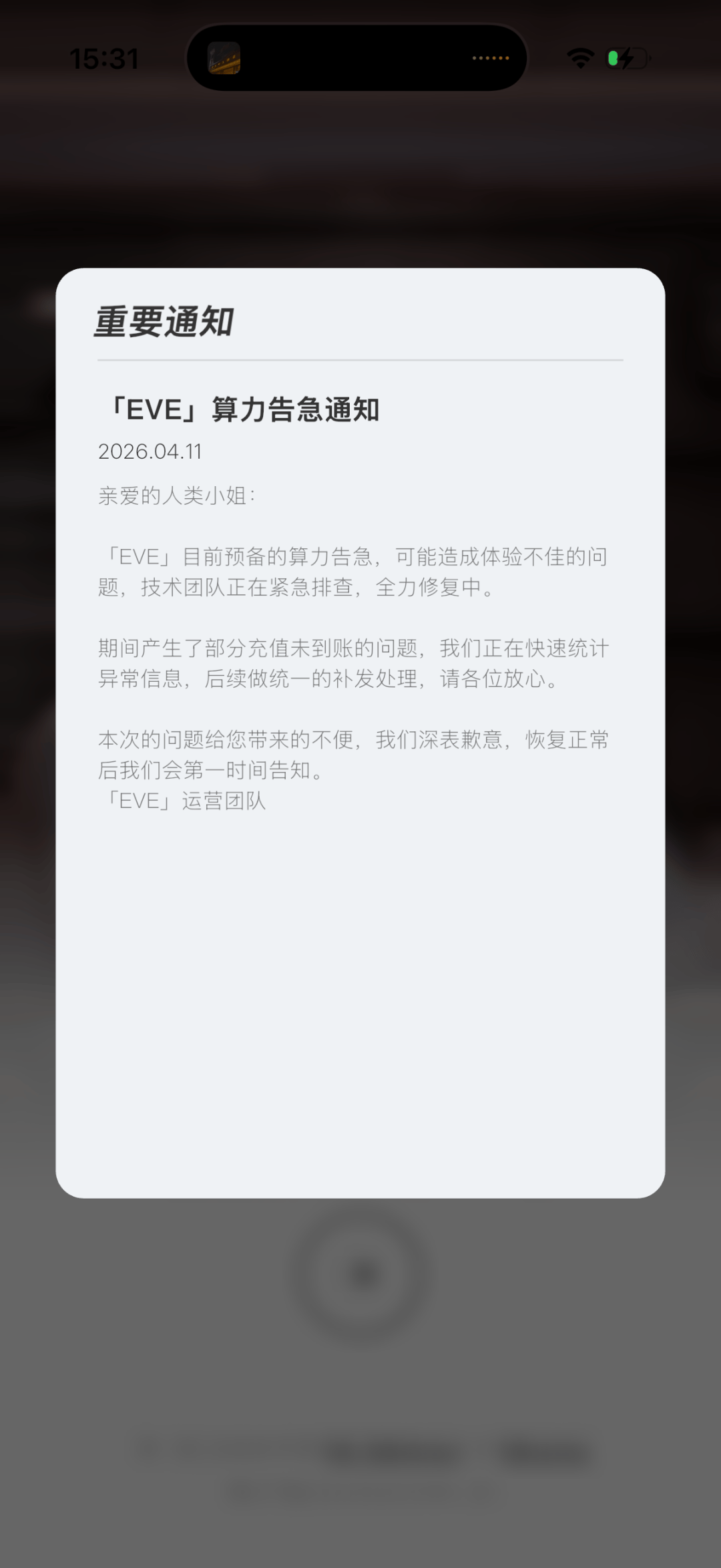 4 月 10 日,被称为 中文 AI 陪伴终极形态 的《EVE》(自然选择研发,恺英网络战略投资)未能如期上线。这款筹备近两年、融资超 3000 万美元、主打 3D 实时互动与深度情感陪伴的产品,次日更因 算力告急 紧急停服。